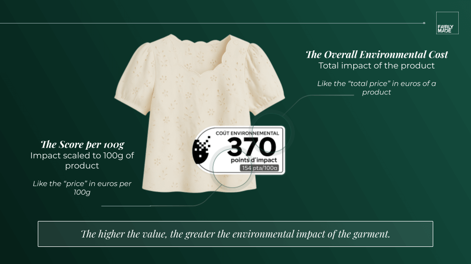 - A smaller score indicating the impact per 100 grams of the product.
