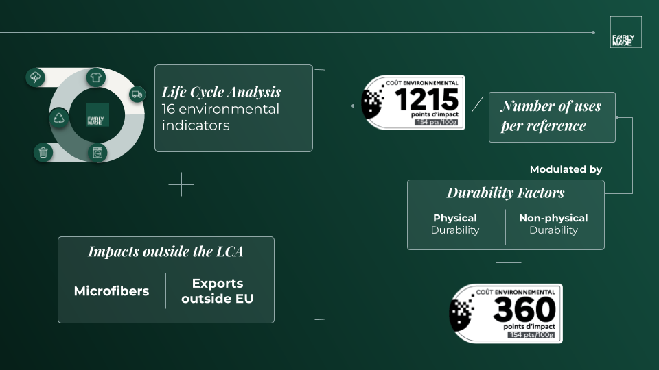The final score is adjusted for the number of uses and durability factors, both physical and non-physical, giving a comprehensive view of the product’s impact.