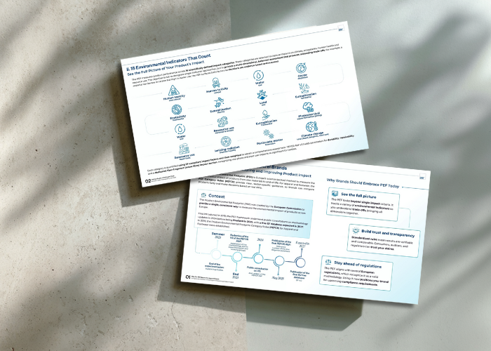 Cette ressource vous accompagne pas à pas : comment fonctionne le PEF, quelles données il utilise, et comment il peut vous aider à prendre de meilleures décisions pour l’ensemble de vos produits. Que vous prépariez votre marque aux régulations européennes, optimisiez vos matériaux ou développiez des stratégies circulaires, ce guide vous offre une vision claire et pratique et montre comment intégrer le PEF dans votre travail quotidien.